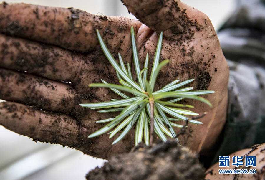 今年是李家三兄弟接力守护400多株野生银杉的第38个年头。经过多年研究实验,银杉的人工育种繁殖已基本成功,叶片背面两条粉白色气孔带是银杉的显著特征。如今,李光华、李光禄和科研人员一起培育了3000多株银杉,最大的树径差不多和汤碗碗口一样粗。新华网发(汪新摄)
