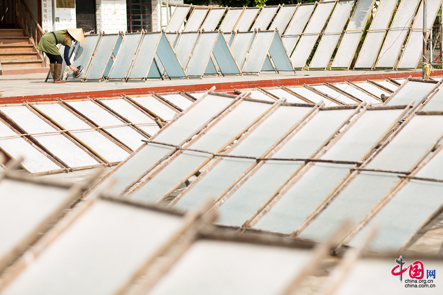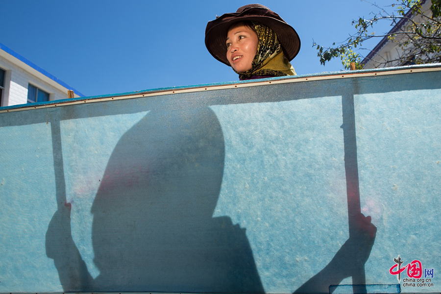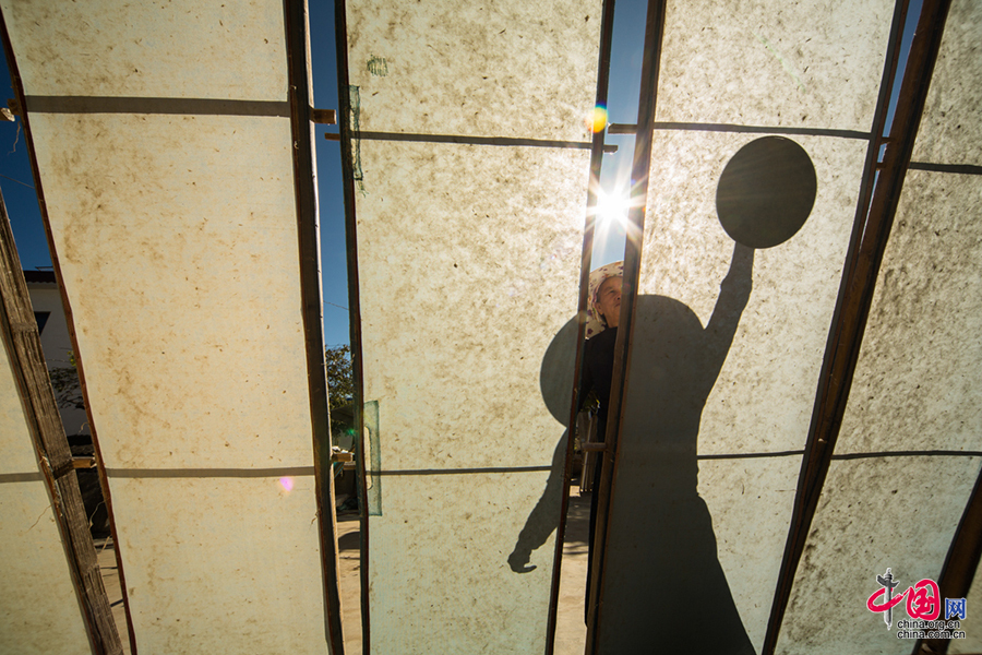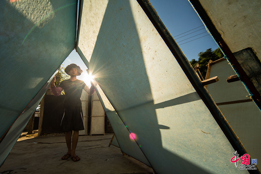 在阳光下晾晒在纸模上的傣纸,干燥后需用口面平滑的工具进行压平抛光。图片提供:稀捍行动