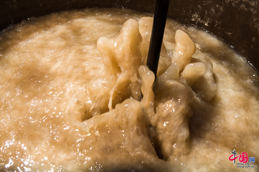 搅拌纸浆的瞬间。经过充分的搅拌,构树皮纤维充分分解均匀散布在水中。图片提供:稀捍行动