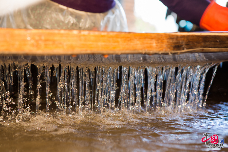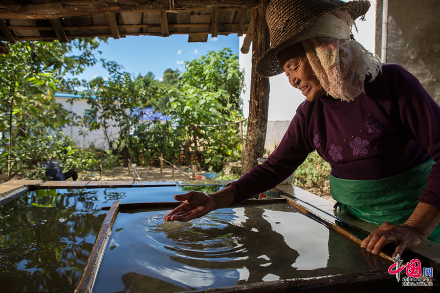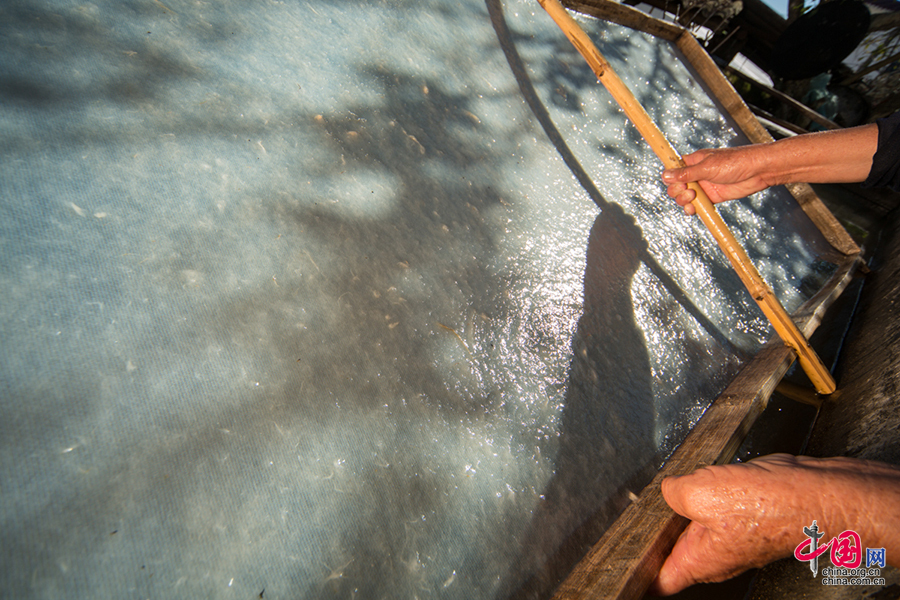 捞纸的瞬间。晶莹剔透的水帘,不含杂质。环境友好的制作工艺,几乎无污染的制作。图片提供:稀捍行动