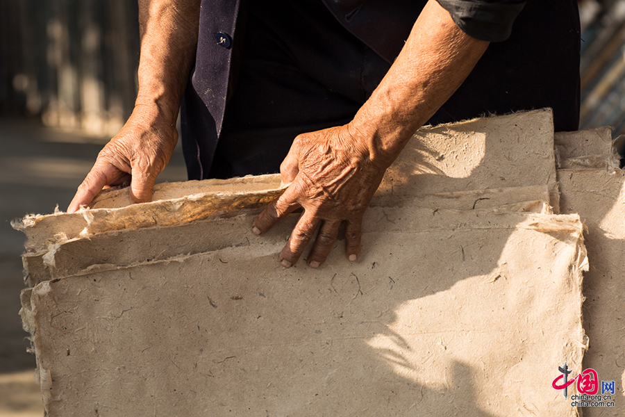 收纸。夕阳西下,最后一轮的晒纸结束,阳光晴好的日子,每人每天可以做500张。图片提供:稀捍行动