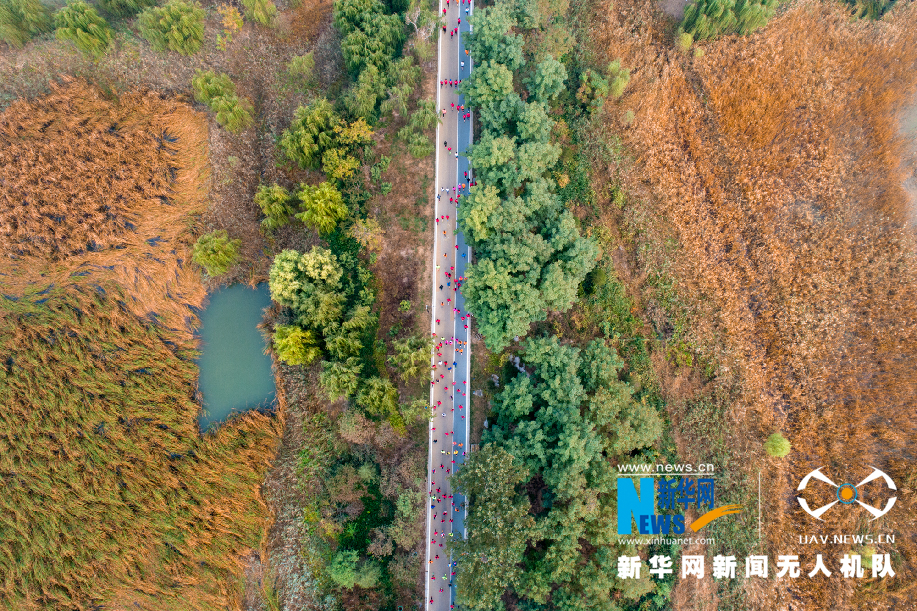 长跑爱好者在山东省高青县慢城旅游路上健身。新华网发 (张维堂摄)