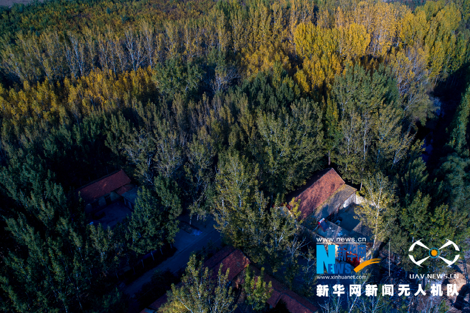 深秋时节,山东省高青县沿黄百里,层林尽染,金色的杨林、绿色的麦田、五彩斑斓的树叶把高青的秋天装扮得格外美丽,与乡村民居融为一体,构成一幅秋日画卷。