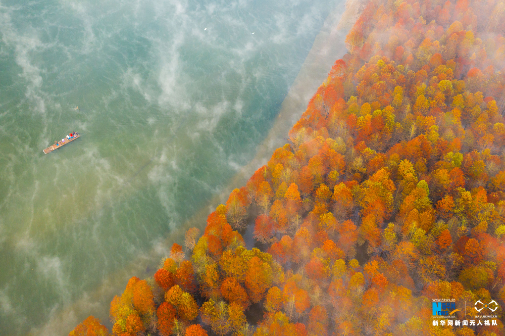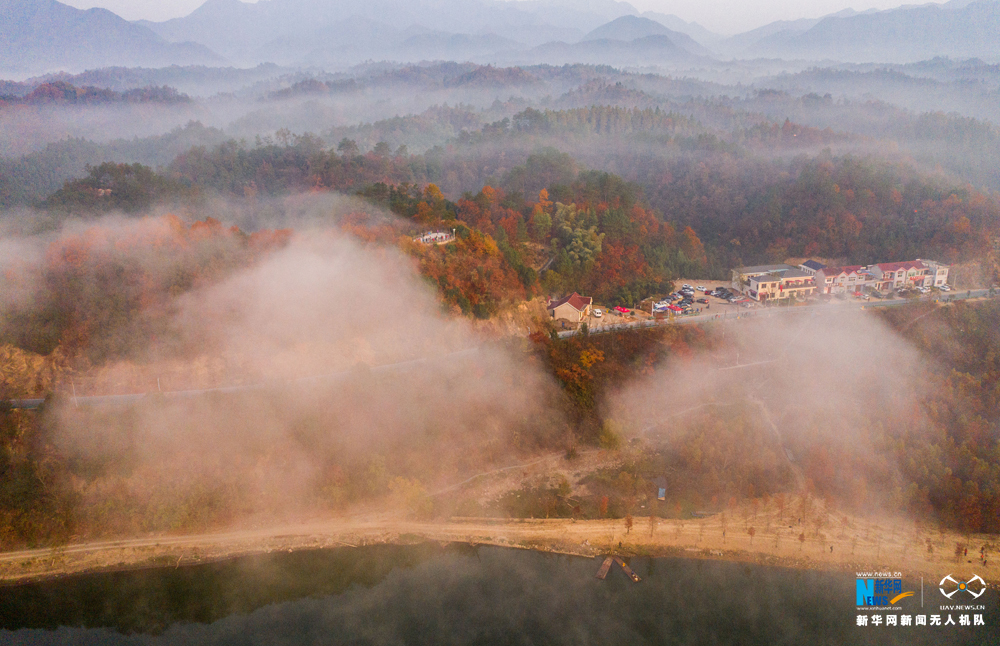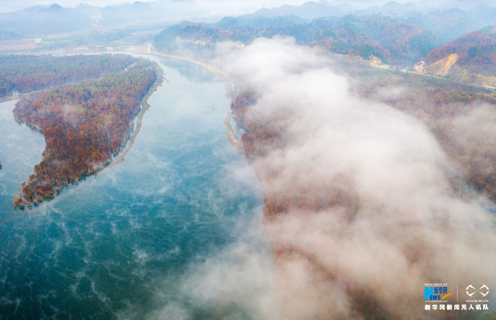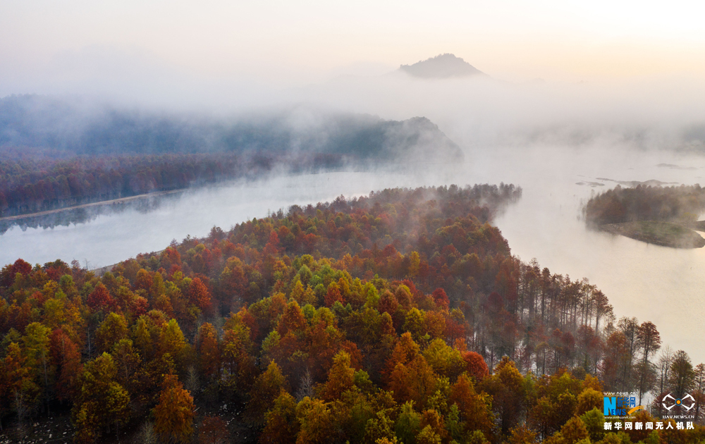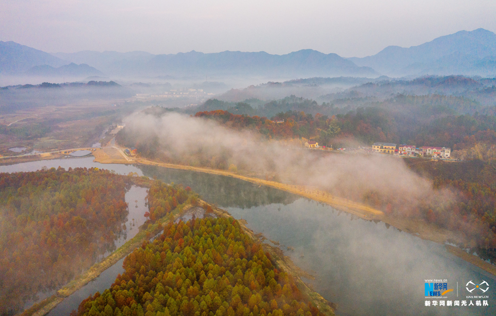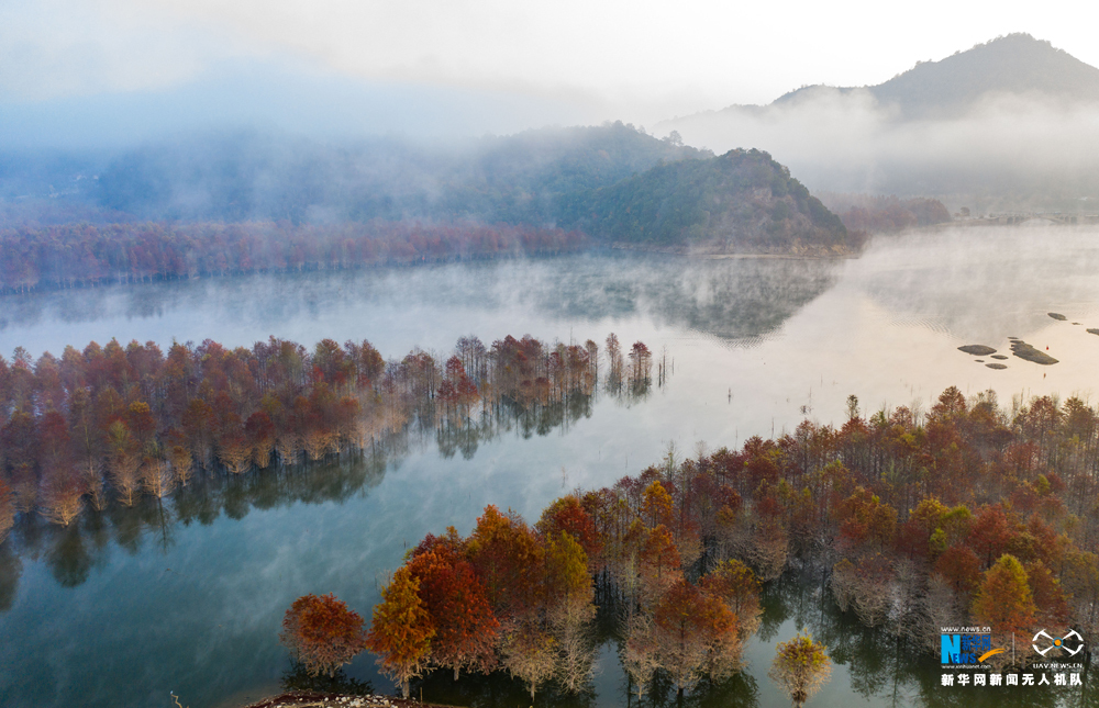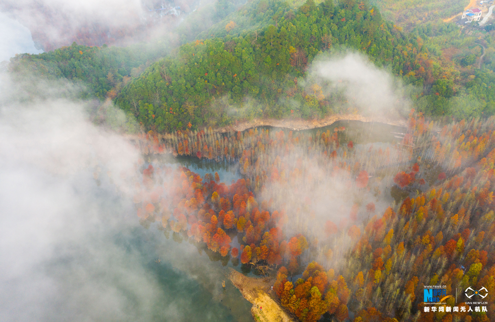 安徽省宁国市方塘乡青龙湾水库云雾缭绕,2000余亩红杉林在云雾中时隐时现,呈现出油画般的美景,吸引大批游人前来观赏。新华网发(王文摄)