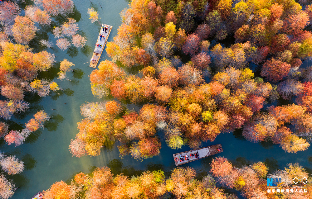 安徽省宁国市方塘乡青龙湾水库拍摄的红杉林(无人机拍摄)。新华网发(王文 摄)
