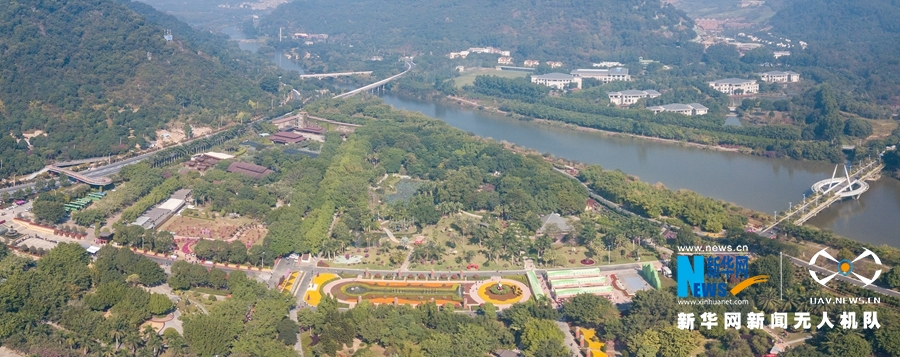 ????漳州花博园依山傍水。地处国道324线和小溪流之间的室外展园形似“三角洲”,冬季依旧绿意葱茏(拼接照片,无人机拍摄)。新华网肖和勇 摄