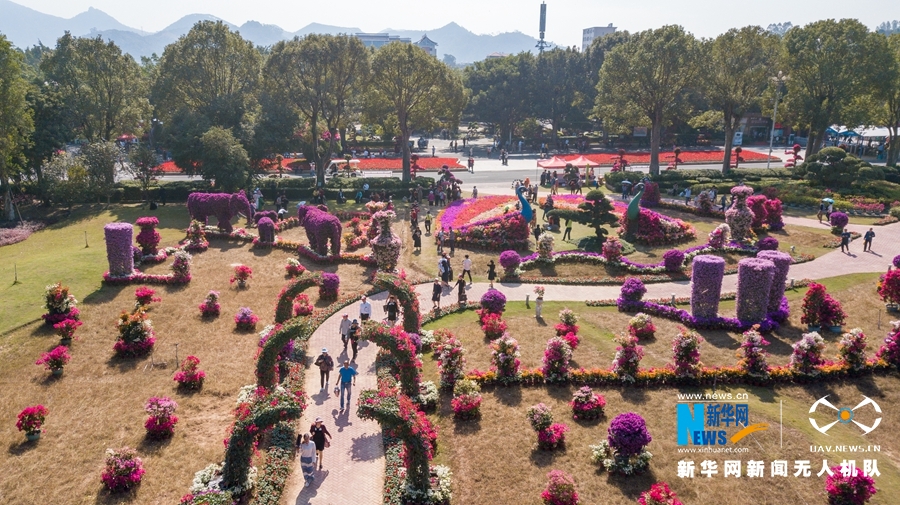 ????多彩三角梅拼摆成孔雀造型,成为花博园网红打卡地(无人机拍摄)。新华网 肖和勇 摄