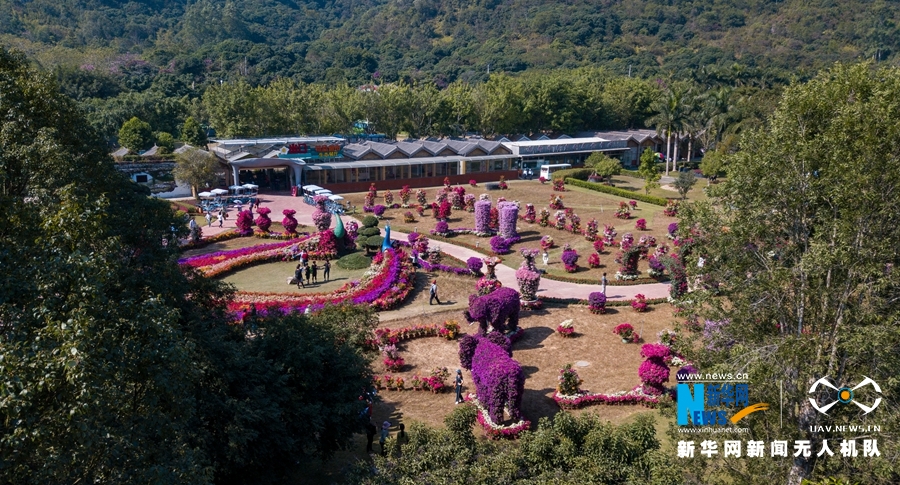 ????这是绿树掩映下的创意三角梅园区(无人机拍摄)。新华网 肖和勇 摄