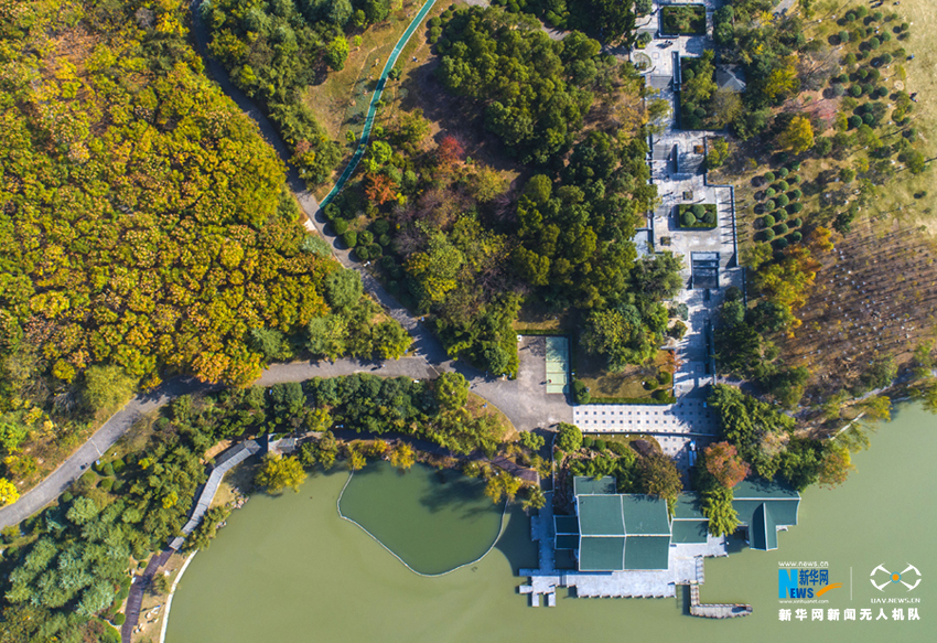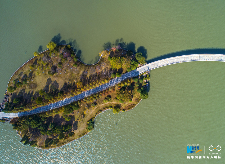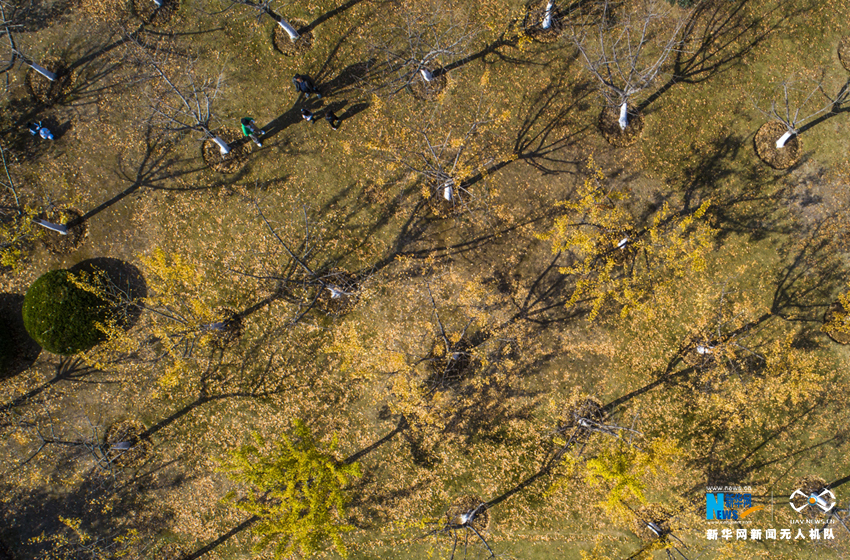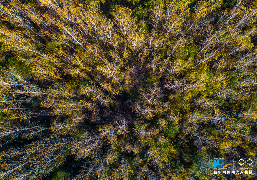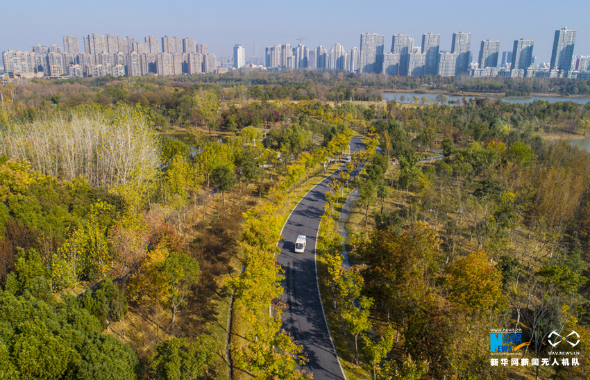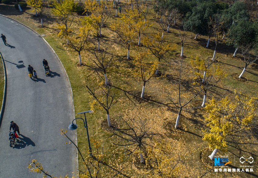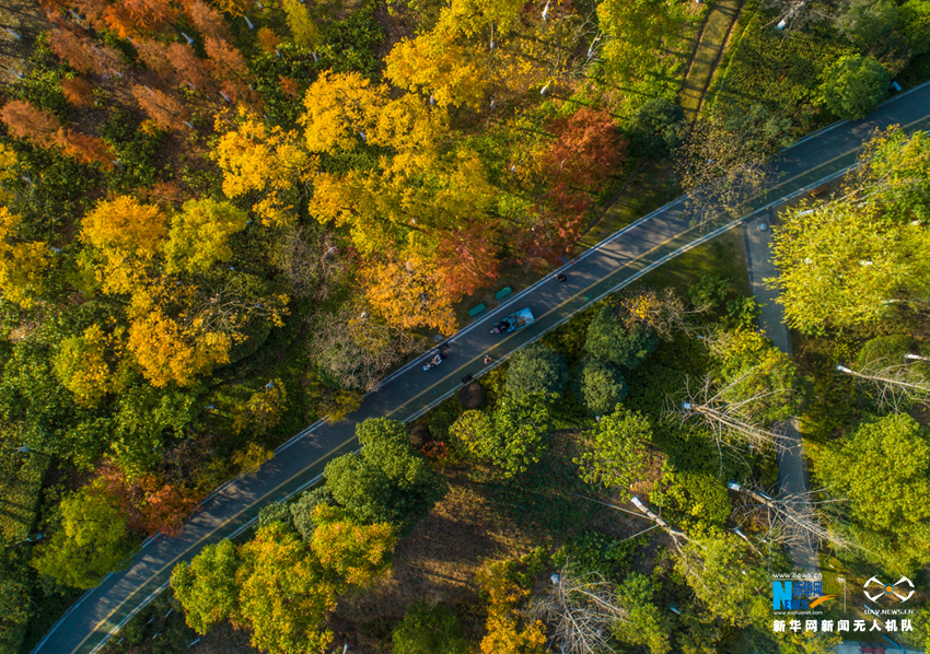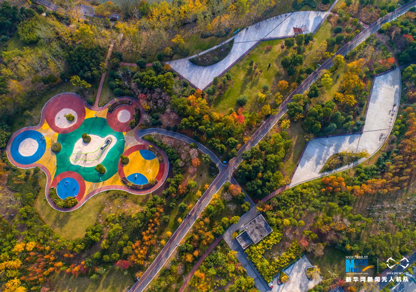 ????初冬时节,安徽省合肥市各大公园秋色未减,金黄的银杏、火红的枫叶将公园景区映照得色彩斑斓,空中俯瞰宛如油画一般。新华网(张大岗摄)