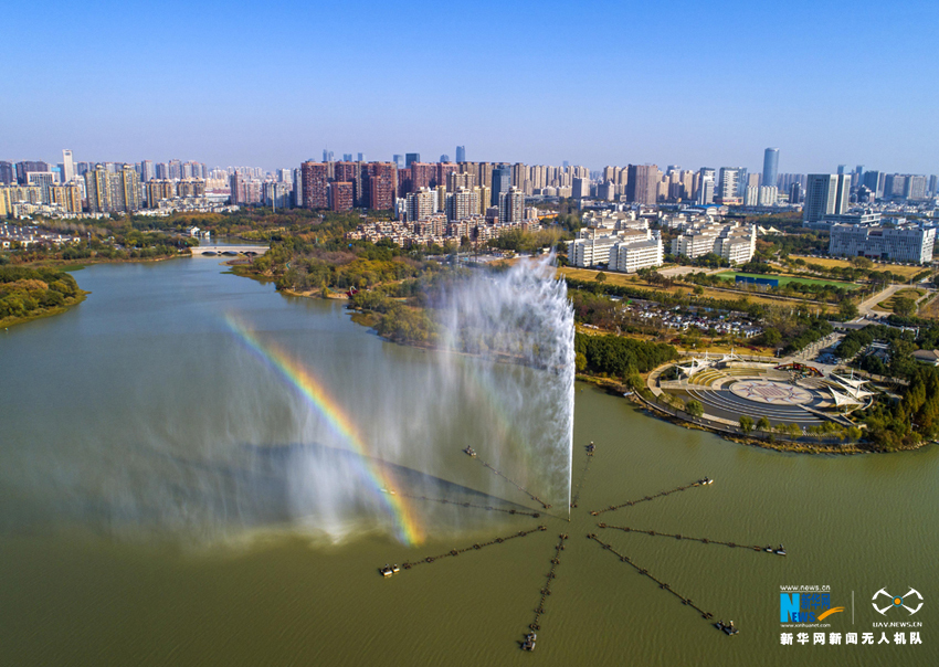 ????安徽省合肥市翡翠湖公园内,喷泉在阳光的照射下形成一道彩虹。新华网(张大岗 摄)