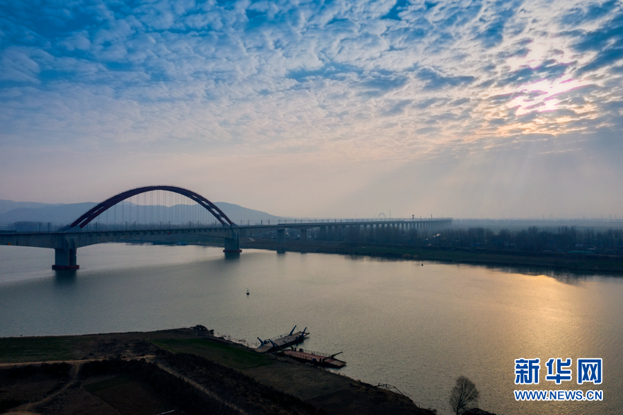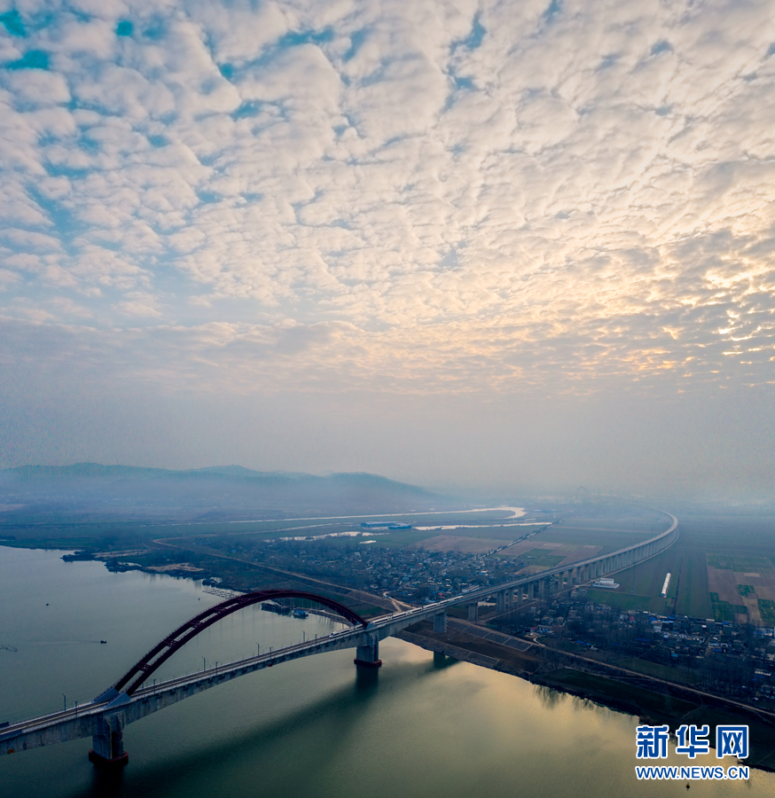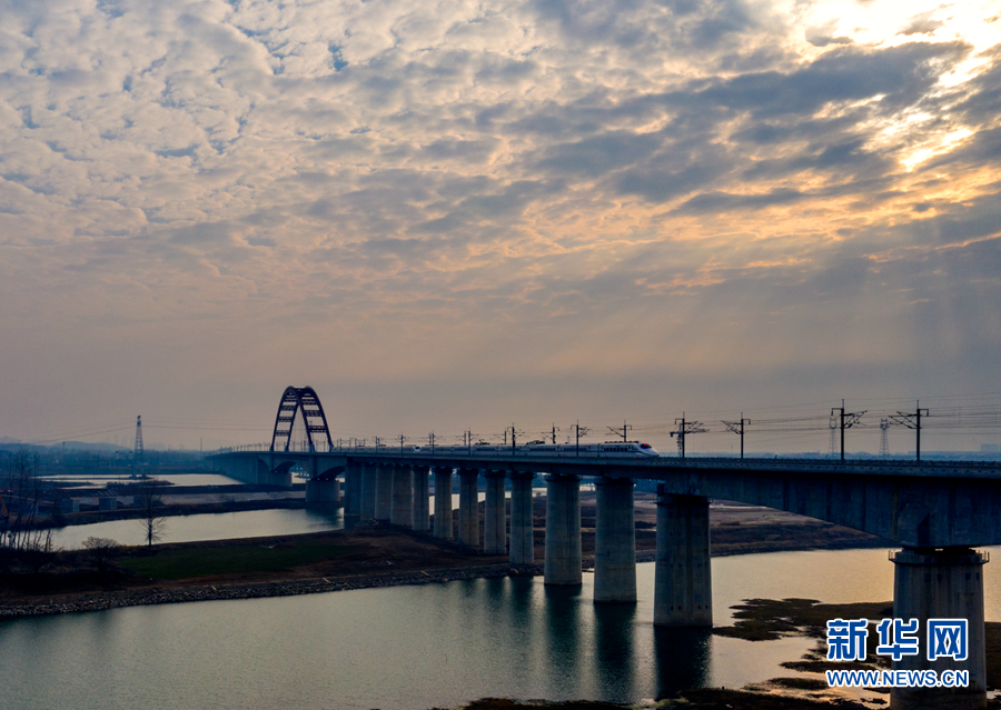 ????2020年1月1日清晨,新年的第一缕霞光映照古城寿县,新开通不久的商合杭高铁像一道彩虹,与纵横交错的河道相映成辉,飞驰的列车穿梭其间,构成一幅美丽的冬日画卷。新华网发(孟伟摄)