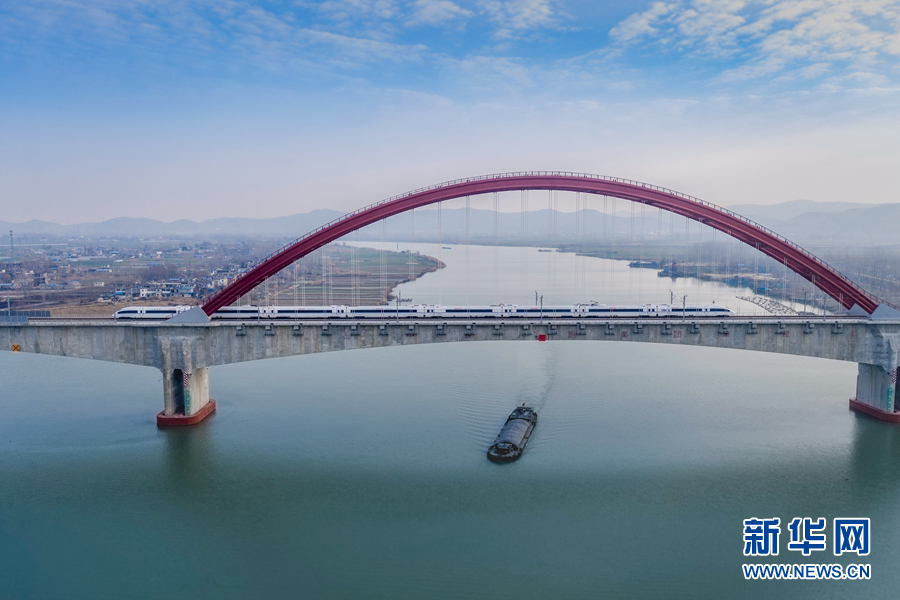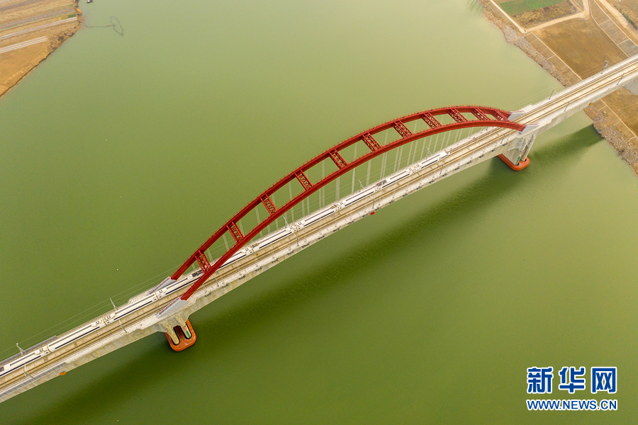 ????列车飞驰在商合杭高铁跨淮河特大桥上。新华网发(孟伟 摄)