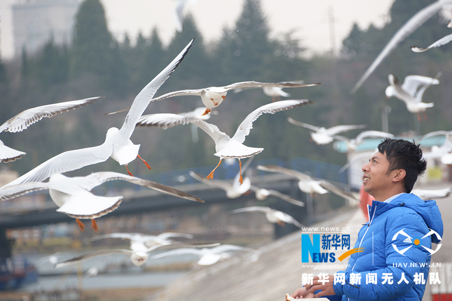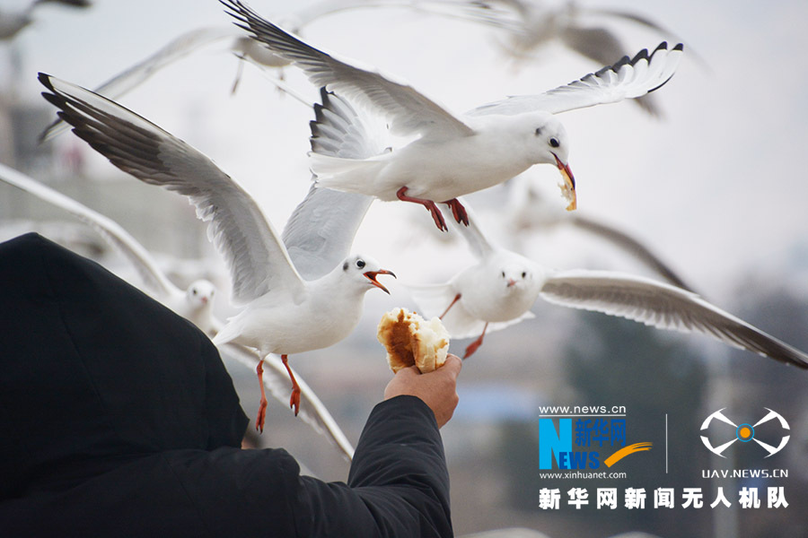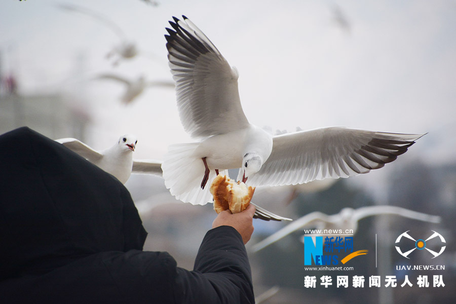 市民给红嘴鸥投食。新华网 徐华陵 摄