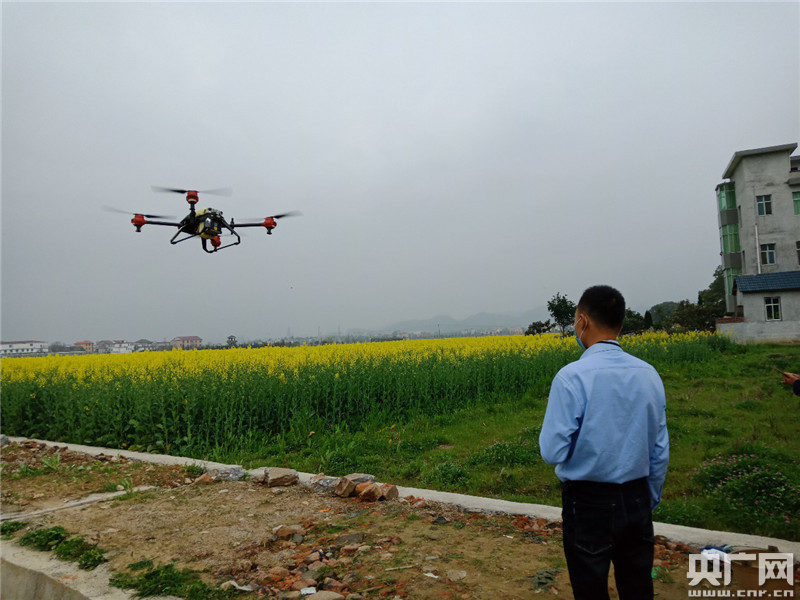 央广网莲花3月1日消息(记者胡斐通讯员李文、朱婷婷)一架轻巧灵敏的无人机,满载农药缓缓起飞,在琴亭镇杨枧村的油菜地低空飞行喷洒农药,贫困户刘才良忍不住竖起大拇指称赞:“政府的无人机太牛了,喷药效率高,效果也好!”