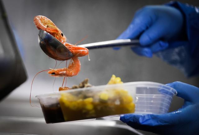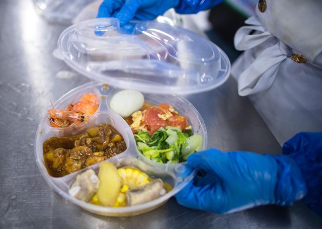 ↑3月6日,工作人员将餐品打包。新华社记者 肖艺九 摄