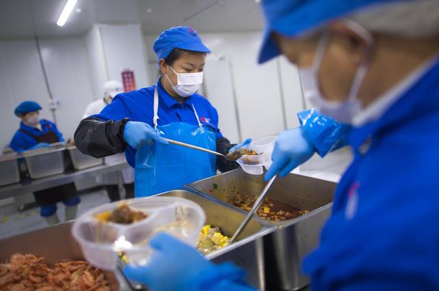 ↑3月6日,工作人员在配餐。新华社记者 程敏 摄