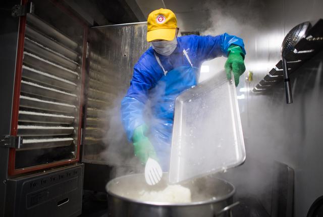 ↑3月6日,工作人员将蒸熟的米饭装入桶中准备配餐。新华社记者程敏 摄