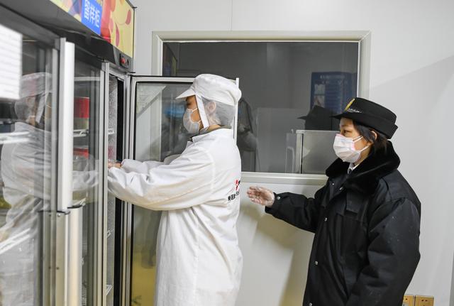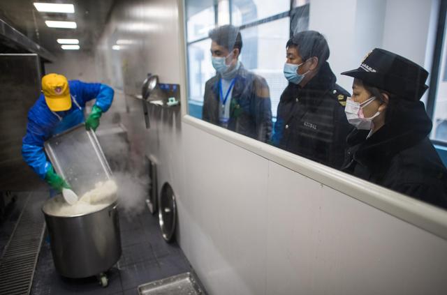 ↑3月6日,武汉东西湖区市场监督管理局执法人员邹红宁(右一)与同事卢庆(右二)在监督配餐工作。为保证食品安全,武汉东西湖区市场监督管理局派专人到供餐公司进行驻点,全程监督餐品的生产加工流程。新华社记者肖艺九 摄