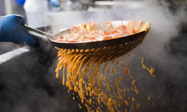 ↑3月6日,武汉餐厨配供应链管理有限公司的厨师在炒菜。新华社记者 肖艺九 摄