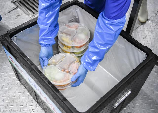 ↑3月6日,工作人员将盒饭放入保温箱。新华社记者 程敏摄
