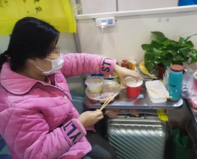 ↑3月6日,在武汉东西湖方舱医院,一位患者在吃午饭。新华社发