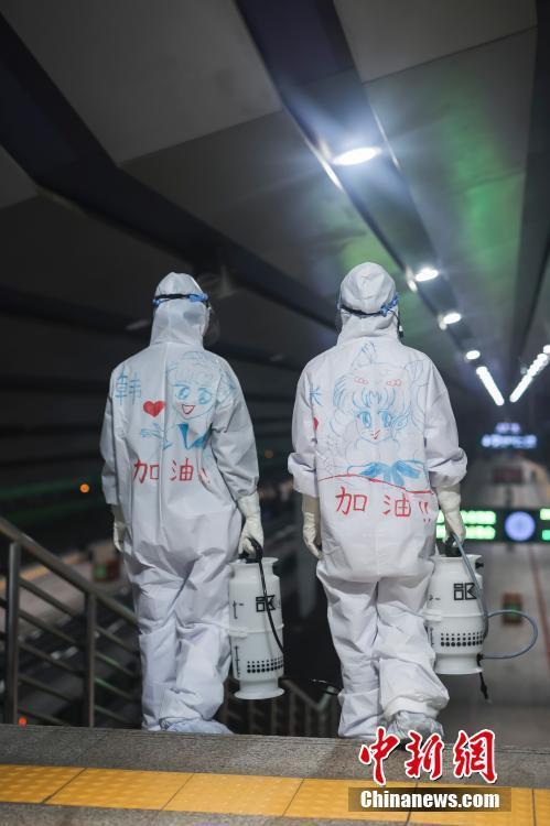 在北京三大火车站的战“疫”一线,有一支专业负责消毒的“娘子军”,她们手拎10多公斤的消毒桶,身穿防护隔离服,穿行在车站与列车之间。图为二人执行消毒任务。防护隔离服后面的卡通美少女图案,出自张轩旗之手。她通过这样的方式,给自己和队友鼓励打气。中新社记者贾天勇 摄