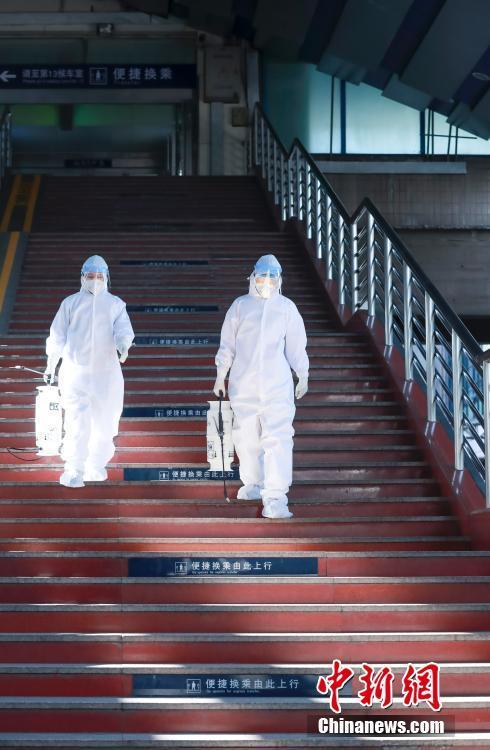 在北京三大火车站的战“疫”一线,有一支专业负责消毒的“娘子军”,她们手拎10多公斤的消毒桶,身穿防护隔离服,穿行在车站与列车之间。图为二人拿着消毒桶走下站台。中新社记者贾天勇 摄