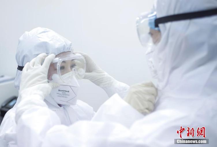 在北京三大火车站的战“疫”一线,有一支专业负责消毒的“娘子军”,她们手拎10多公斤的消毒桶,身穿防护隔离服,穿行在车站与列车之间。图为二人出发前互相整理防护装备。中新社记者贾天勇 摄