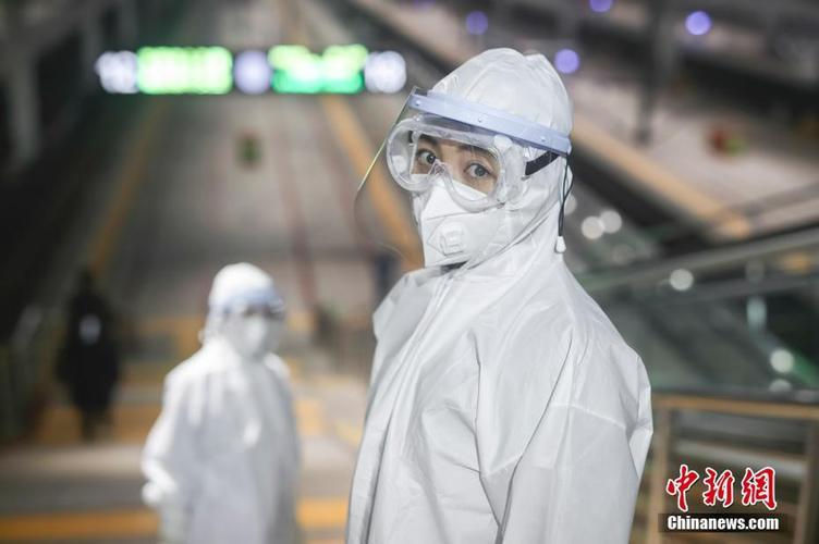 在北京三大火车站的战“疫”一线,有一支专业负责消毒的“娘子军”,她们手拎10多公斤的消毒桶,身穿防护隔离服,穿行在车站与列车之间。图为韩秋谨在执行消毒任务的路上。中新社记者贾天勇 摄