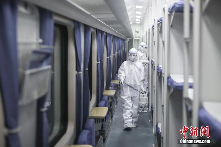 在北京三大火车站的战“疫”一线,有一支专业负责消毒的“娘子军”,她们手拎10多公斤的消毒桶,身穿防护隔离服,穿行在车站与列车之间。图为二人对一辆普速卧铺车厢消毒。中新社记者贾天勇 摄