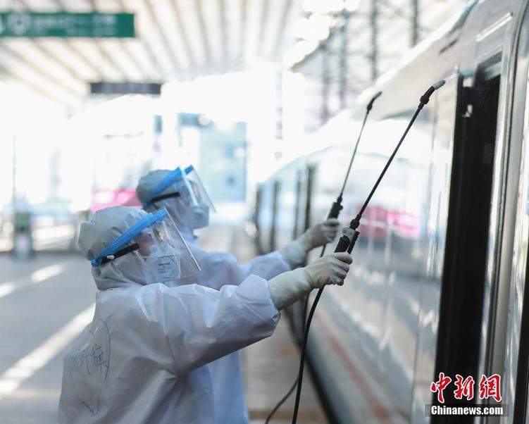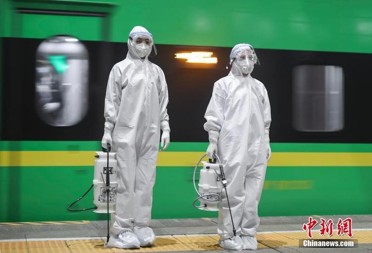 在北京三大火车站的战“疫”一线,有一支专业负责消毒的“娘子军”,她们手拎10多公斤的消毒桶,身穿防护隔离服,穿行在车站与列车之间。图为二人对一辆列车消毒后,在站台列队等候下一辆列车进站。中新社记者贾天勇 摄