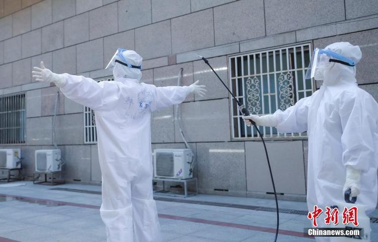 在北京三大火车站的战“疫”一线,有一支专业负责消毒的“娘子军”,她们手拎10多公斤的消毒桶,身穿防护隔离服,穿行在车站与列车之间。图为完成消毒任务后,二人互相给防护隔离服消毒。中新社记者贾天勇 摄
