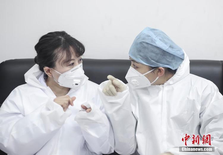 在北京三大火车站的战“疫”一线,有一支专业负责消毒的“娘子军”,她们手拎10多公斤的消毒桶,身穿防护隔离服,穿行在车站与列车之间。图为张轩旗(左)、韩秋谨(右)在休息室核对将要消毒的车次信息和工作细节。中新社记者贾天勇 摄