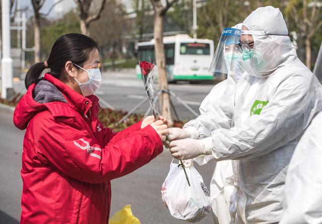 新华社照片,武汉,2020年3月8日 方舱医院前的告别 3月8日,贵州医疗队的穆茂(右)在分别时向痊愈患者送上鲜花。当日,武汉体育中心方舱医院送走最后一批痊愈患者出院,正式休舱。这些痊愈的患者将被转运到康复驿站,进行隔离观测后再回家。 新华社记者肖艺九 摄