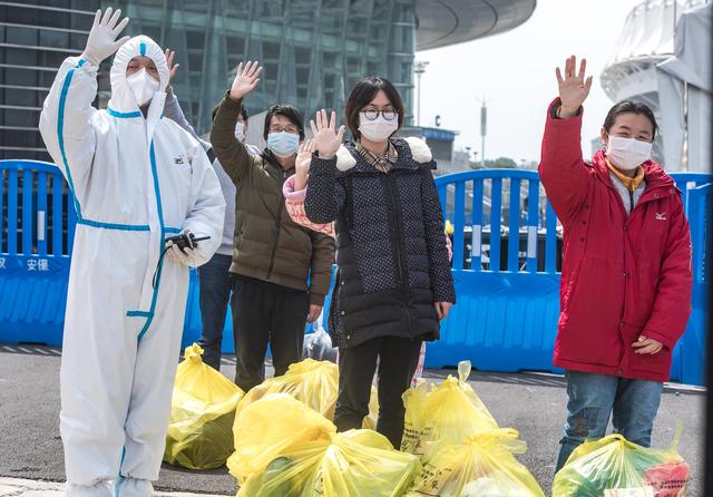 新华社照片,武汉,2020年3月8日 方舱医院前的告别 3月8日,痊愈患者与贵州医疗队员挥手告别。当日,武汉体育中心方舱医院送走最后一批痊愈患者出院,正式休舱。这些痊愈的患者将被转运到康复驿站,进行隔离观测后再回家。 新华社记者肖艺九 摄