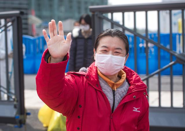 新华社照片,武汉,2020年3月8日 方舱医院前的告别 3月8日,一名痊愈患者与贵州医疗队员挥手告别。当日,武汉体育中心方舱医院送走最后一批痊愈患者出院,正式休舱。这些痊愈的患者将被转运到康复驿站,进行隔离观测后再回家。 新华社记者肖艺九 摄