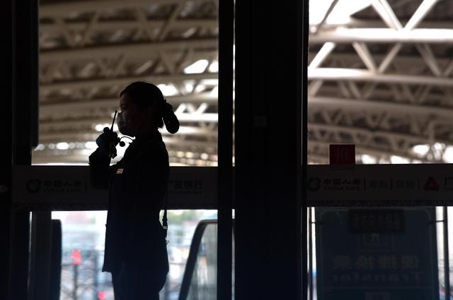 ↑中国铁路南昌局集团有限公司南昌站客运员李金红在检票口通过对讲机报告旅客进站情况(2月7日摄)。新华社记者 彭昭之摄