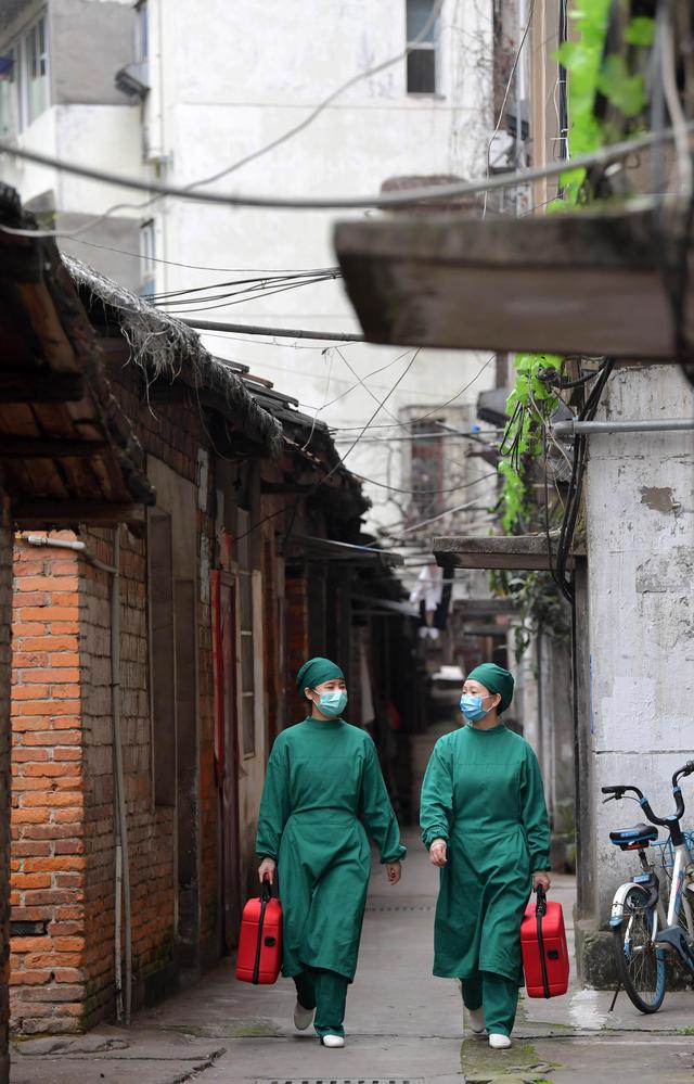 ↑南昌市第六医院公共卫生科医生胡小玲(右)和同事在南昌市西湖区为居民送药、送诊上门(2月26日摄)。新华社记者 彭昭之摄