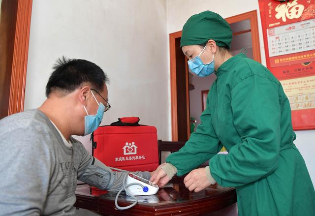 ↑南昌市第六医院公共卫生科医生胡小玲(右)在南昌市西湖区居民家中为居民测量血压(2月26日摄)。新华社记者 彭昭之摄