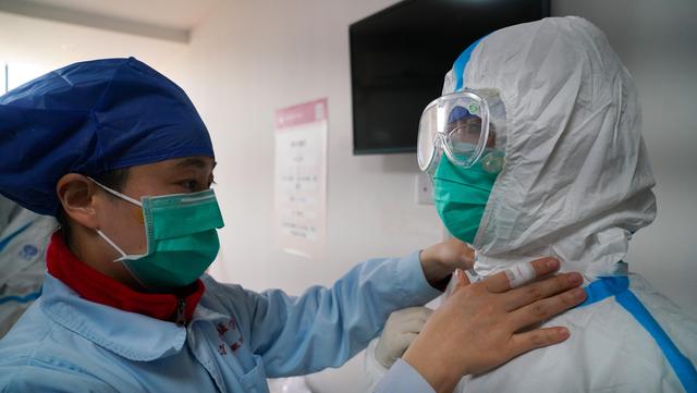 ↑江西中医药大学附属医院两名女性医护人员准备进入隔离病房(2月18日摄)。新华社记者 胡晨欢 摄
