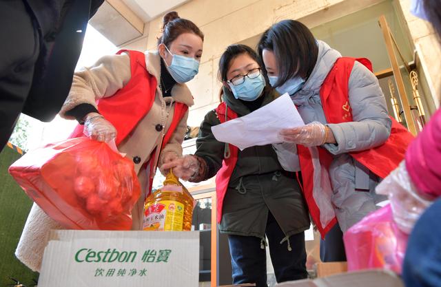 ↑江西省南昌市红谷滩新区沙井街道工作人员艾志云(右一)、胡春丽(右二)和志愿者一起为封闭楼栋居民送去每日生活必需品(2月5日摄)。新华社记者彭昭之 摄