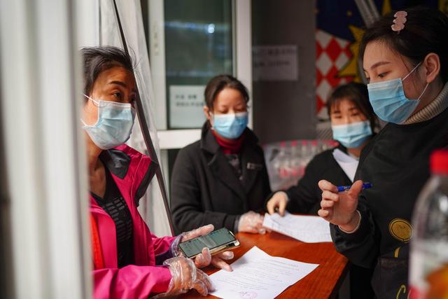 ↑江西省南昌市红谷滩新区沙井街道丰和社区书记徐晓琳(左一)在对一家刚恢复营业的餐饮店进行检查(2月26日摄)。新华社记者周密 摄