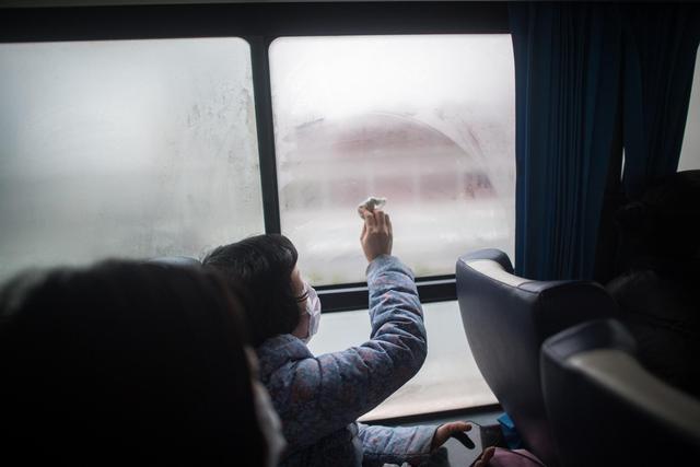 3月12日,一名解除隔离的治愈患者擦拭车窗,想眺望窗外。当日,在武汉软件工程职业学院康复驿站,85名新冠肺炎治愈出院患者在此进行14天医学观察后,达到医学标准,成功解除隔离。他们将由专车运送至所属社区附近的集散点,然后在社区工作人员的陪同下回家。新华社记者肖艺九摄影报道