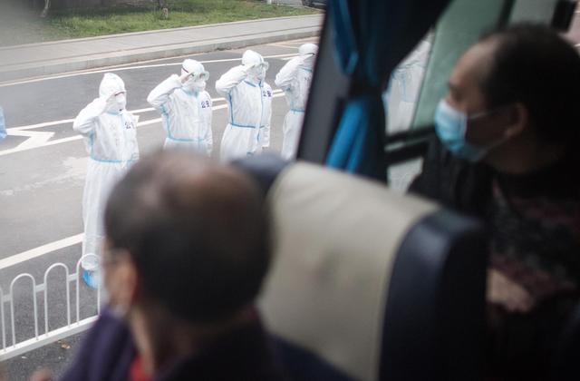 3月12日,公安民警向踏上回家路的治愈患者敬礼。