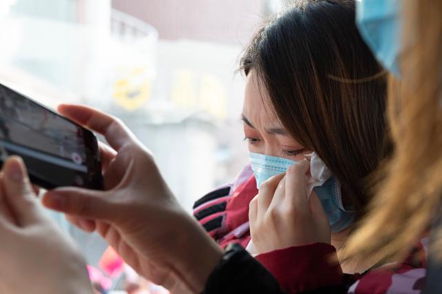 3月21日,一名医疗队员在前往襄阳刘集机场途中忍不住落泪。