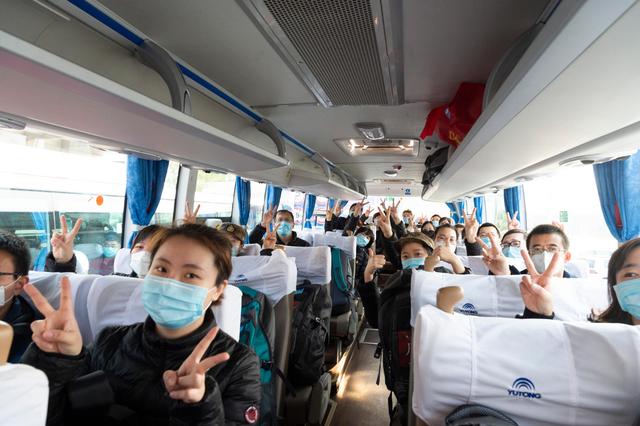 3月21日,医疗队员们在前往襄阳刘集机场途中打出胜利手势。