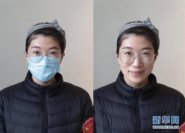 宁夏支援湖北襄阳医疗队队员李婷离开襄阳前摘下口罩露出笑容(拼版照片,3月20日摄)。 新华社发(谢剑飞 摄)