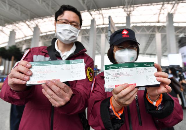 3月21日,中国赴塞尔维亚抗疫医疗专家组专家郭禹标(左)和熊艳展示登机牌。