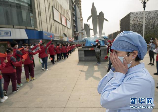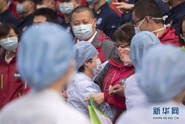 3月21日,武汉市第一医院的医护人员(前)送别天津市医疗队队员。新华社记者费茂华摄