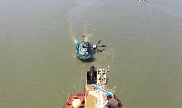 图为无人机挂载尾气检测装置对船舶尾气开展检测张家港海事局供图